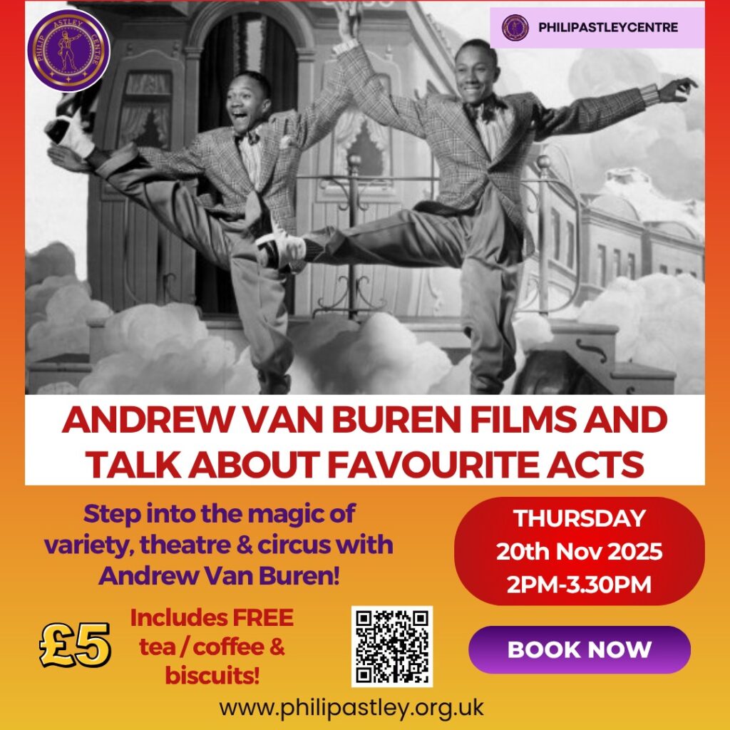 Andrew will share his insights, background and details around some of his favourite acts from the world of variety and circus through the ages. With film footage of the acts this promises to be an interesting fun and entertaining afternoon.